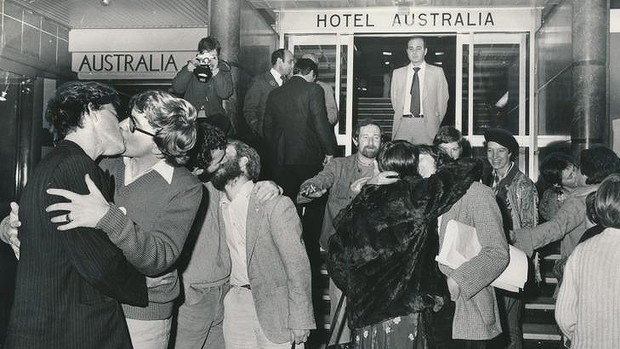 - Melbourne, 1979. Protesters kiss outside the Australia Hotel after two men were convicted of the charge of offensive behaviour for kissing on the same spot. Image: The Age library