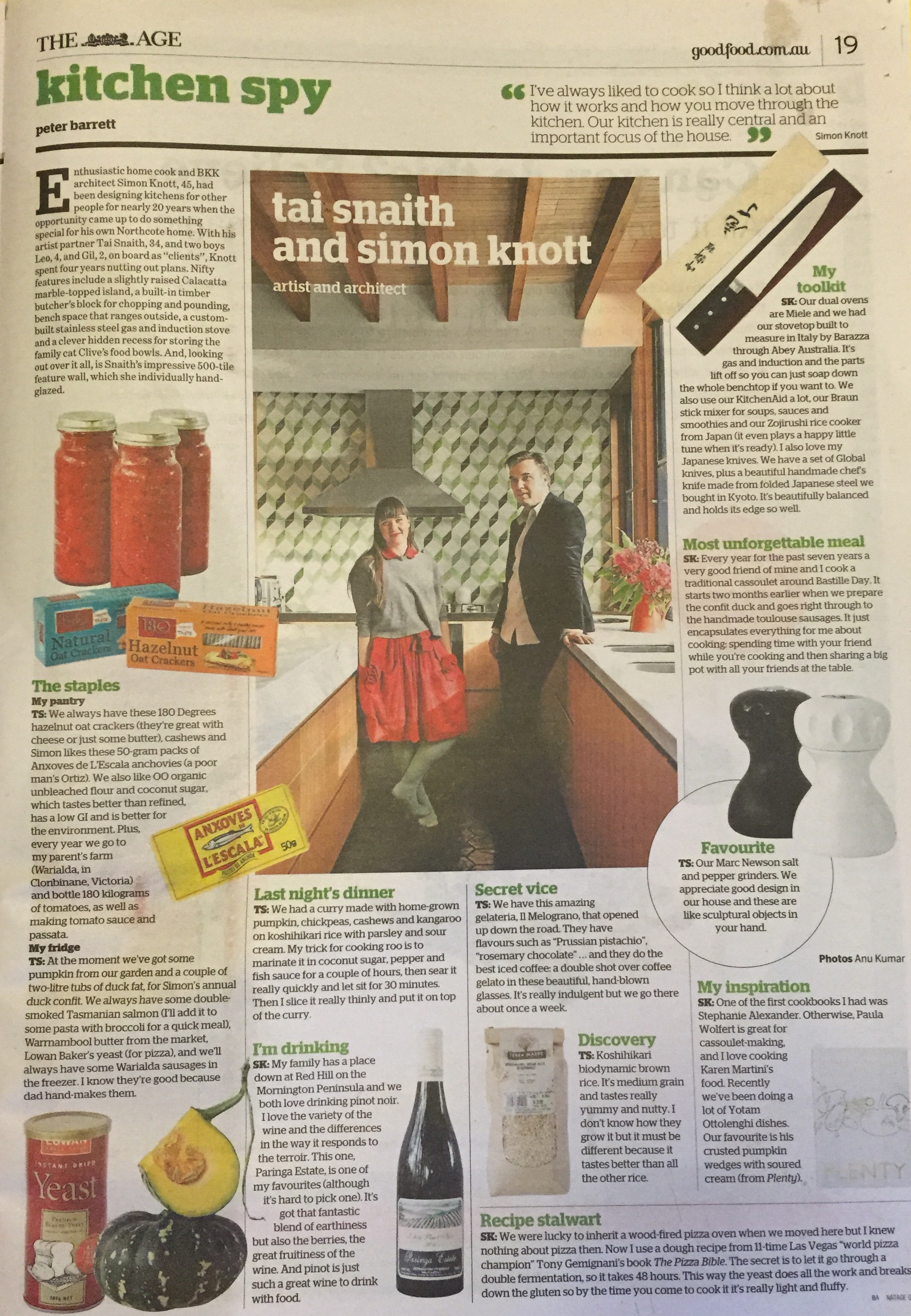 Artist Tai Snaith and her architect partner Simon Knott from BKK were given the kitche spy treatment on June 16, 2015. This story appeared in the Age and the Sydney Morning Herald’s Good Food sections. The ‘Doll’s House‘ Simon designed for his family was shortlisted for the 2015 Australian Interior Design Awards, where you can see a few more great images.