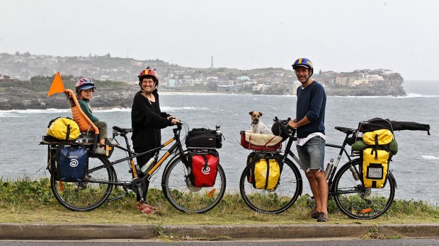 Once a jolly swag family: Patrick Jones, Meg Ulman, their son Woody and dog Zero cycled 6000 kilometres around Australia. Photo: Ben Rushton