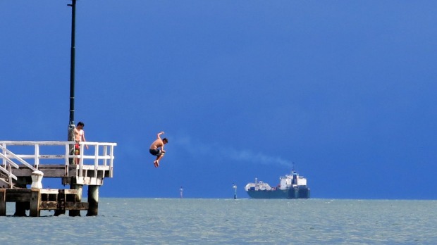 Young men jump from a pier into Port Phillip Bay. Photo: Leigh Henningham