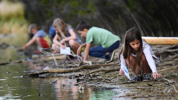 Children collect feathers from the lake at Jells Park. Photo: Joe Armao.