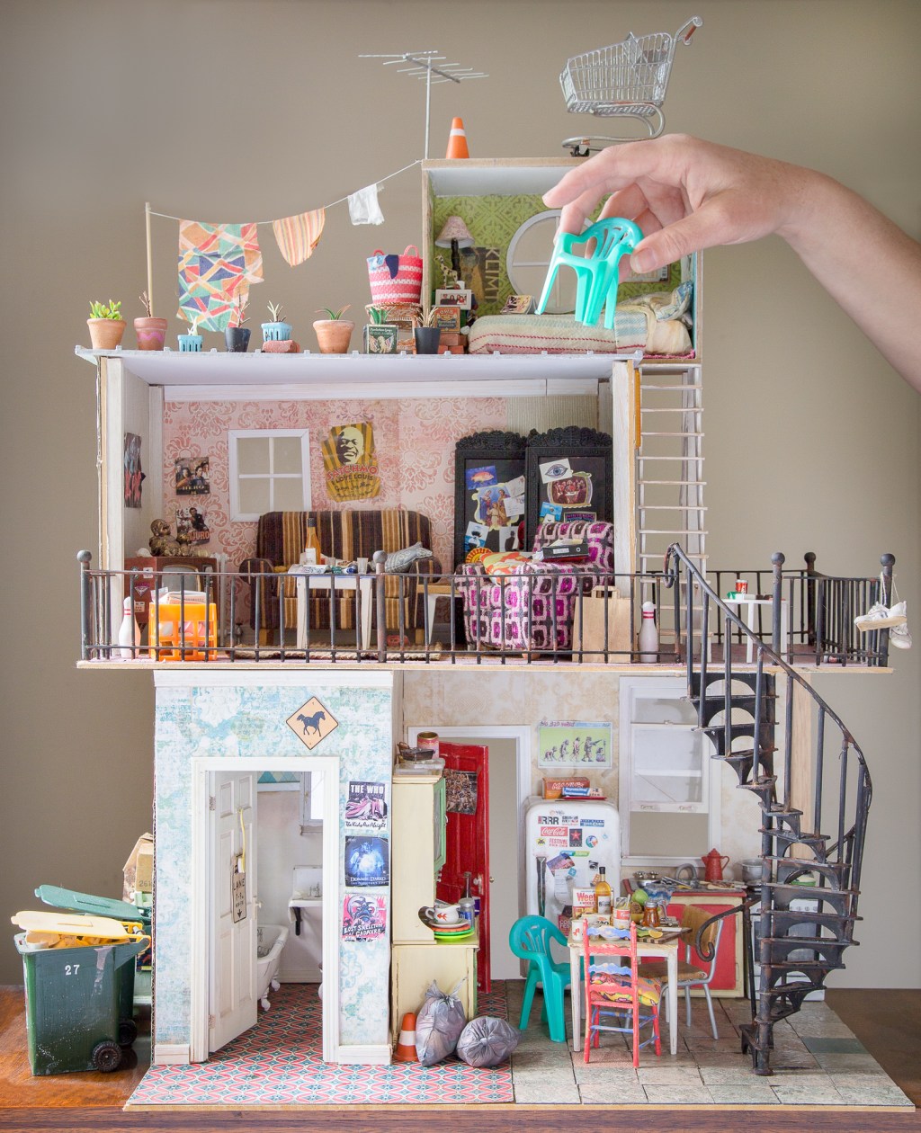 Author Judith Rossell‘s intricate, self-made and realistic miniature share house comes complete with tiny rubbish and RRR sticker on the fridge. Photograph: Emma Byrnes.