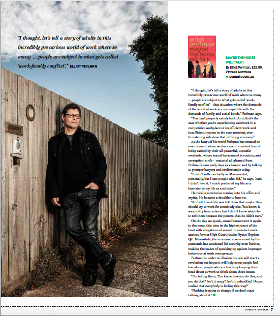 At the heart of his novel Perlman has created an environment where workers are in constant fear of being sacked by their all-powerful, unstable overlords; where sexual harassment is routine, and corruption is rife – material all gleaned from Perlman’s own early days as a lawyer and by talking to younger lawyers and professionals today.
